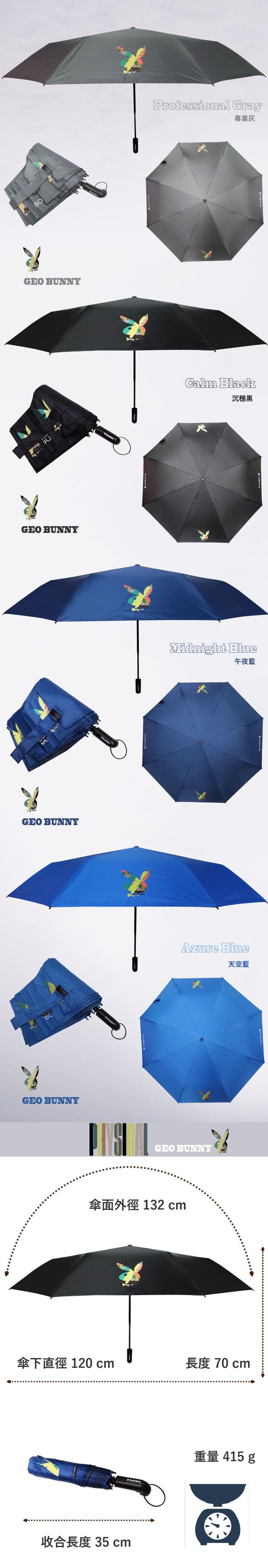 卓越時尚.靈魂精品 2019年度限量款 - 設計圖均已銷毀,僅此一度。顏色選擇:午夜藍 / 天空藍 / 專業灰 / 沉穩黑 ●開傘前請左右搖擺,甩開傘布與傘骨後,按下開關才可避免傘布糾結傘骨產生斷裂或損壞。 ●本產品具自動開收功能,開啟後請依照說明書收合;若自行以手拉方式收回,將導致不可預期之損壞,使用時請注意! ●使用完畢請至於陰乾處晾乾,確保傘布傘骨的乾燥後收合,可延長使用壽命。 ●請勿用於玩耍嬉戲。 ●開傘請勿朝著人開啟,確保於空曠足夠空間的場地使用。 規格 傘面外徑:132cm 傘下直徑:120cm 完全收合35cm 重量:415g 傘骨:鋁氧化黑+FRP防風傘架 中棒:六角氧化黑鐵中棒 傘布:Pongee全遮黑膠布 特殊加工:防UV紫外線高科技加工 製造日期:2018.12 保存期限:10年 產地:中國(紐約品審,台灣監製) 商品編號:PU0418-1 / 47007 設計: NEW YORK PLAOYBOY總公司